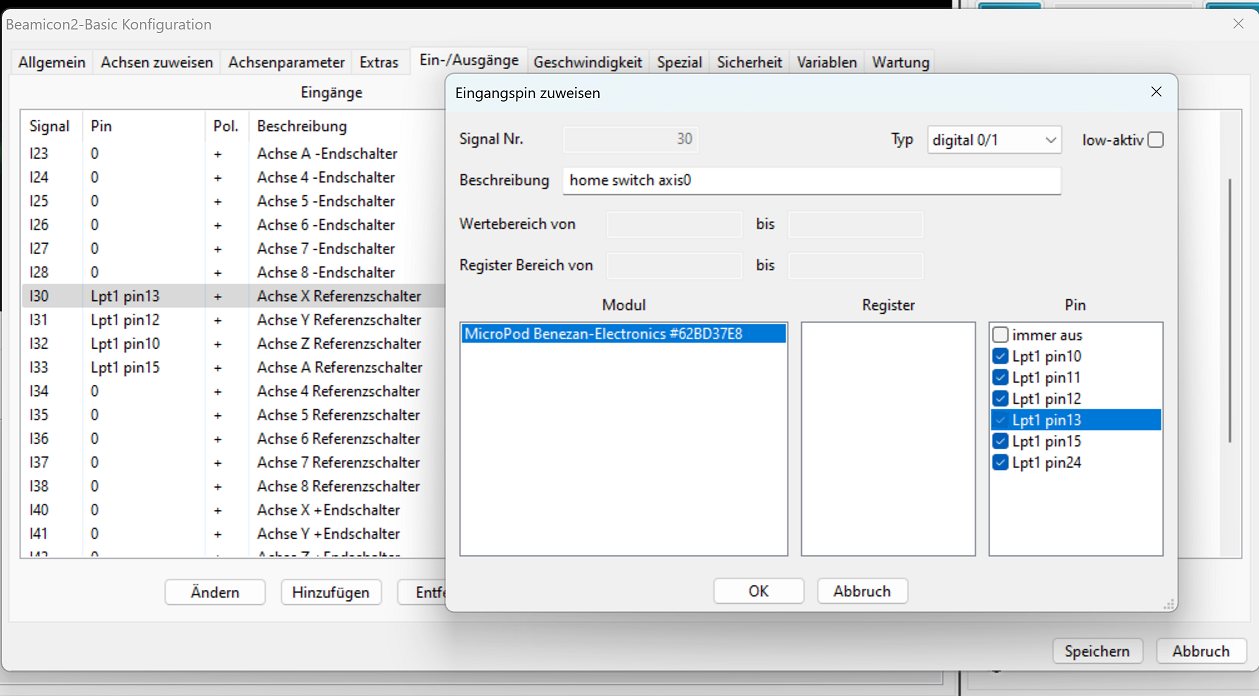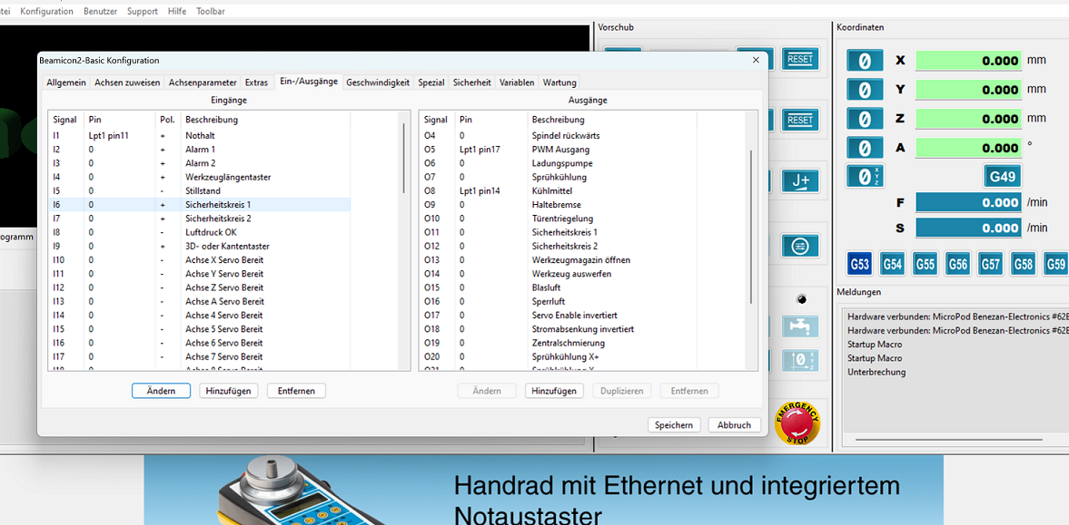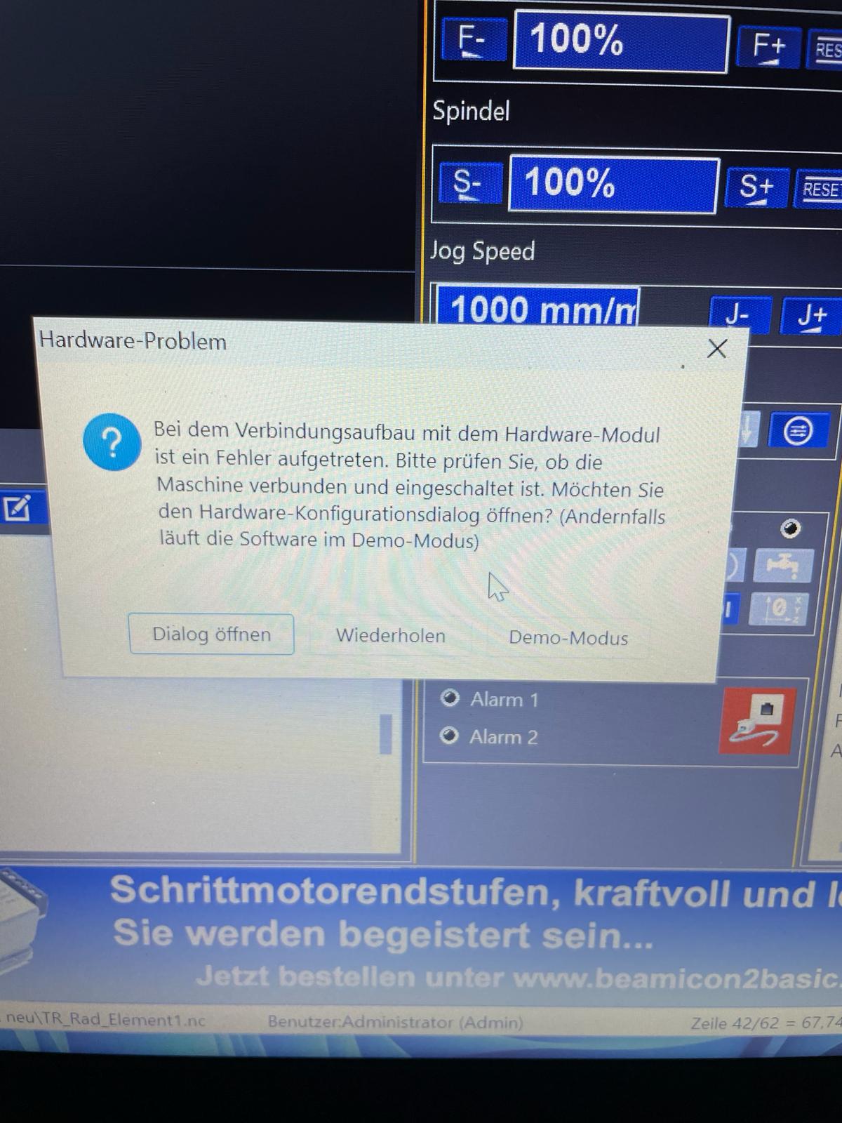 Für die Inbetriebnahme habe ich mir die Linux-Variante Beamicon2 Version 3.19 kopiert und installiert. Danach habe ich die Steuerung eingeschaltet und die hardware in beamicon2 gefunden. Das Programm bestand auf der Aktualisierung der hardware von 1.31 auf 1.41, die ich dann auch angestoßen habe. Die Aktualisierung lief dann auch ohne Fehler durch. Die Maschinenparameter habe ich auf die Maschine angepaßt, soweit ich diese verstanden habe.